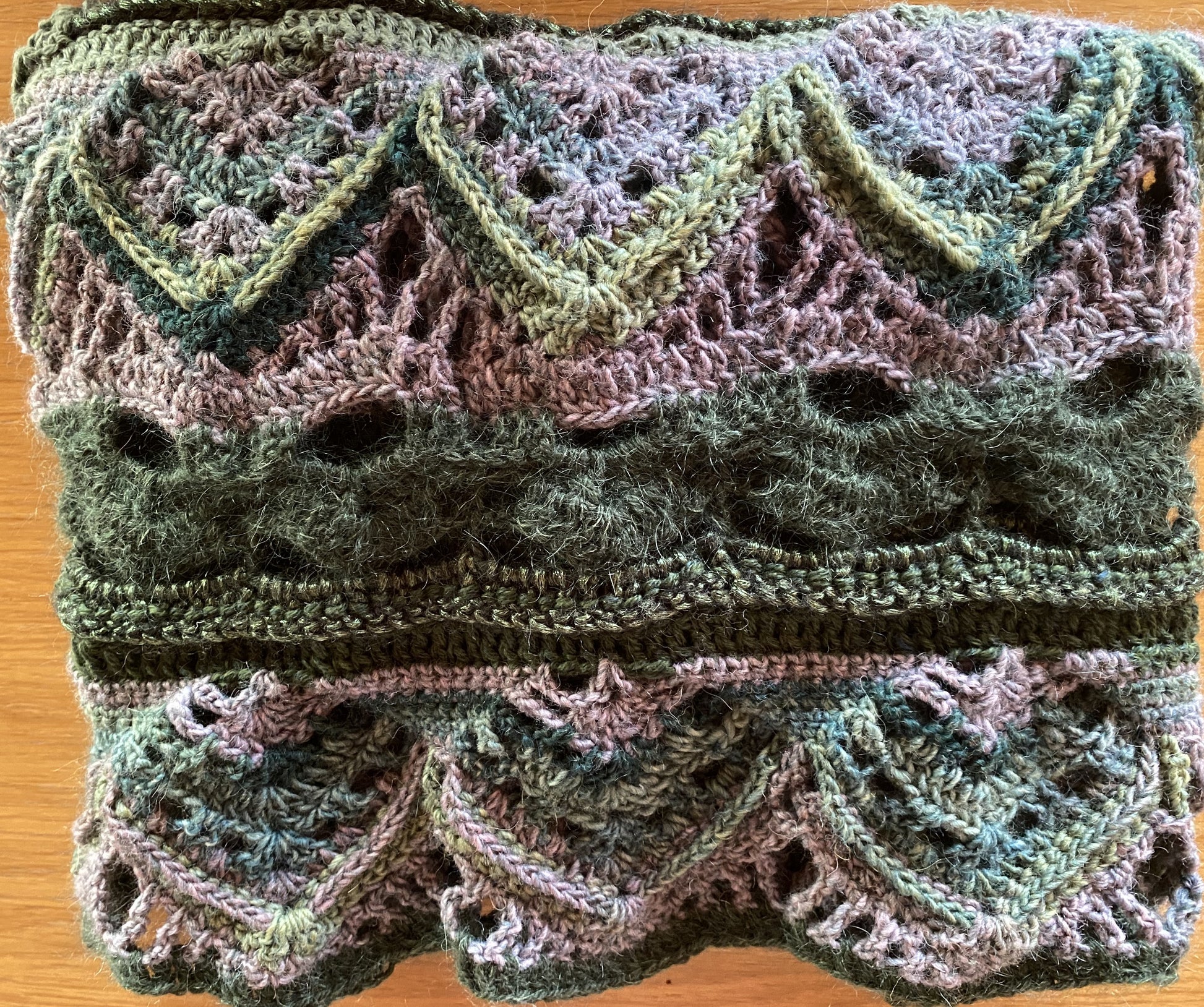 Dette smukke sjal er skabt af en kombination af nyt garn og nøje udvalgte garnrester.Sjalet er helt unikt i farvespil og udtryk og bærer sin egen historie. Perfekt til dig, der elsker håndlavede detaljer og noget, ingen andre har.